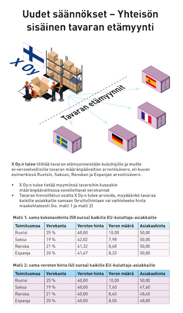 1.7.2021 voimaan astuvat uudet säännökset Yhteisön sisäisessä tavaroiden etämyynnissä vaikuttavat esimerkiksi näin (kuva: Tilisanomat 3/2021):